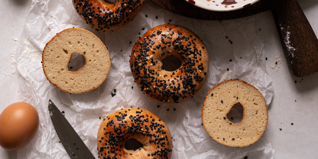 V míse smíchejte jogurt, mouku, lahůdkové droždí, sůl a prášek do pečiva. Následně rukama vypracujte kompaktní těsto – mělo by být měkké, ale nelepivé (pokud lepí, přidáme trochu mouky). Těsto rozdělte na 4 části a z každé z nich pak vypracujeme tvar bagelu. Nakonec připravené bagely potřete rozšlehaným vejce, posypte semínky a pečte v horkovzdušné fritéze na 180 stupňů cca 15-20 minut, dokud nezezlátnou.